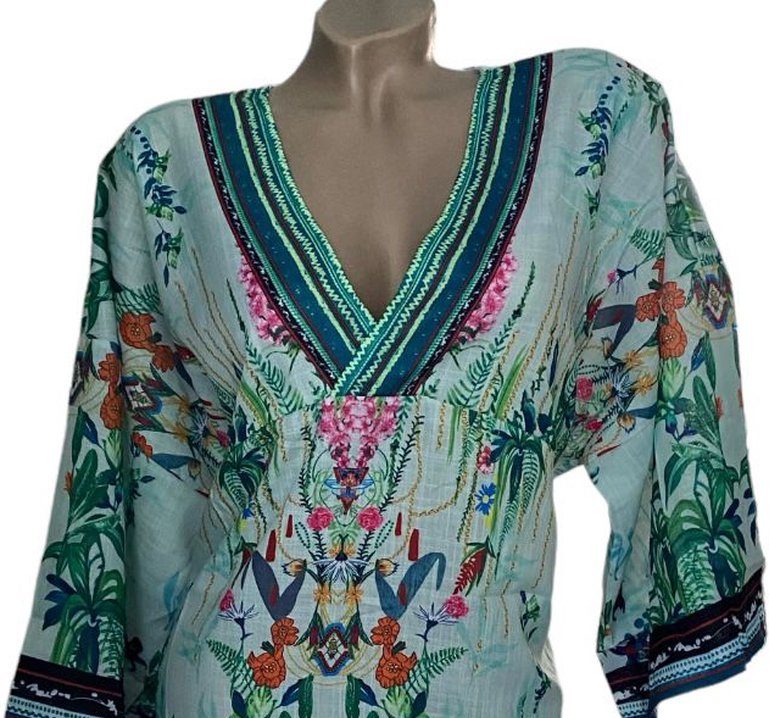 Op zoek naar de perfecte zomerjurk die zowel stijlvol als luchtig is? Deze prachtige multicolor kaftan is de ultieme must-have voor zonnige dagen! De kleurrijke tropische print geeft je outfit een frisse en exotische uitstraling, terwijl de mix van viscose, katoen en linnen zorgt voor een heerlijk licht draagcomfort.