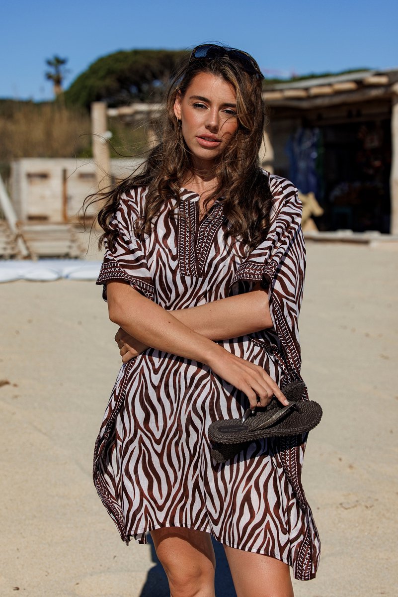 Ga stijlvol en comfortabel de zomer in met deze prachtige beach cover-up uit de Safari-collectie van Pastunette. Deze luchtige tuniek met zebraprint in warme bruintinten is de perfecte aanvulling op je strandlook. Gemaakt van hoogwaardig geweven katoen, voelt deze strandjurk zacht aan op de huid en biedt het optimale ademend vermogen voor warme dagen aan zee of het zwembad.