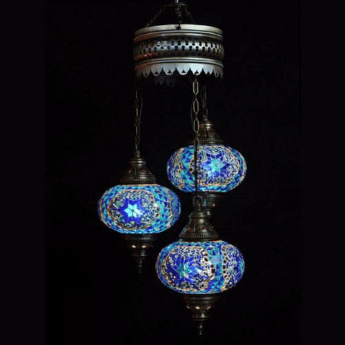 Laat je interieur stralen met deze schitterende Turkse hanglamp in koninklijk blauw. Met drie prachtig handgemaakte mozaïekbollen zorgt deze lamp voor een betoverende lichtval in elke ruimte. Het blauwe glas en het ambachtelijke ontwerp creëren een unieke oosterse sfeer die zowel overdag als ’s avonds de aandacht trekt.