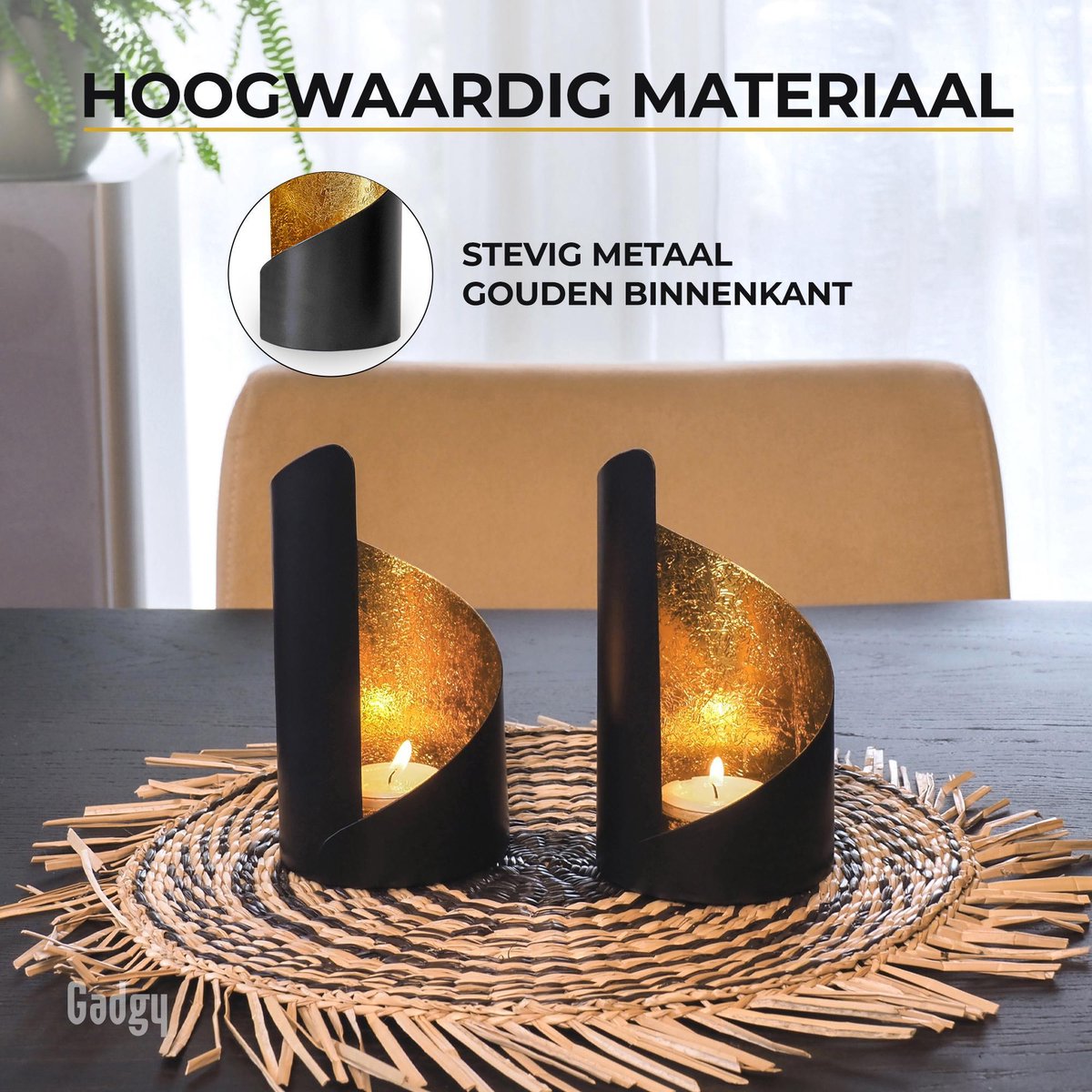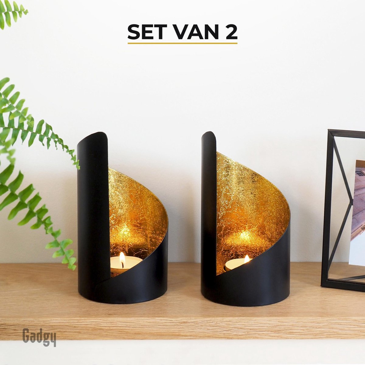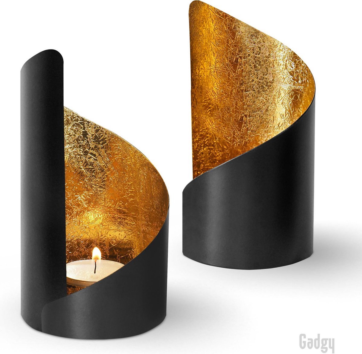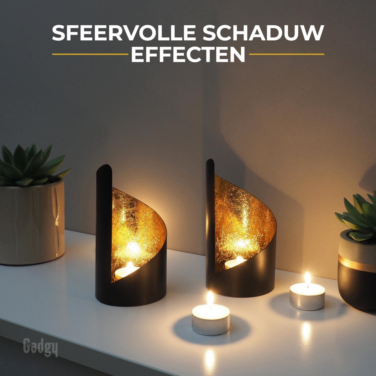 Op zoek naar een stijlvolle manier om sfeer te brengen in je interieur? Deze elegante waxinelichthouders van Gadgy combineren een strak modern design met een warme, gouden gloed. De binnenzijde van gestructureerd goudkleurig metaal reflecteert het kaarslicht op een sfeervolle manier, wat zorgt voor betoverende schaduweffecten.
