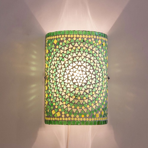 Laat je interieur stralen met deze prachtige handgemaakte oosterse wandlamp in een frisgroen mozaïekdesign. Deze cilinderlamp is niet alleen een bron van sfeervolle verlichting, maar ook een echte eyecatcher voor je woonkamer, hal of slaapkamer. De combinatie van kleurrijk glas en stevig metaal zorgt voor een uniek lichteffect dat elke ruimte betovert met een warme, rustgevende gloed.