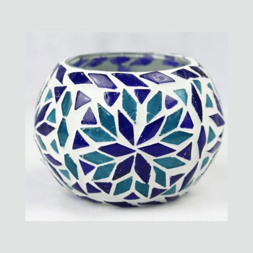 Breng sfeer, stijl en warmte in huis met deze prachtige waxinelichthouder van mozaïekglas. Met een diameter van 10 cm is deze ronde houder perfect als subtiel middelpunt op je eettafel, dressoir of nachtkastje. De diepe blauw- en turquoise tinten zorgen voor een betoverend lichtspel zodra het kaarslicht door het glas schijnt.